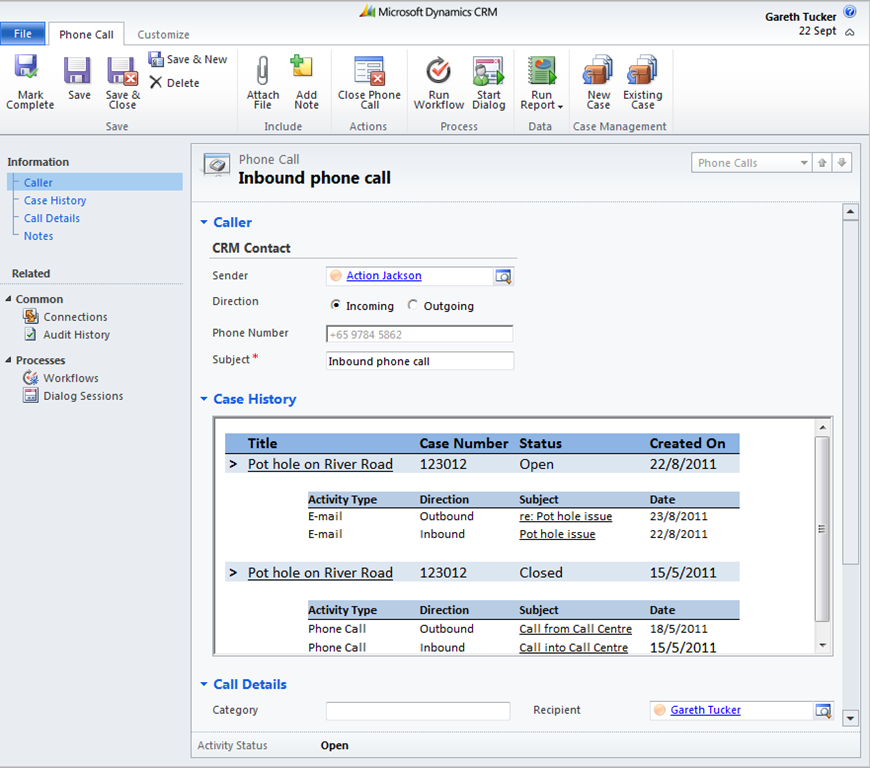 Example: Microsoft Dynamics CRM having inbound calls record